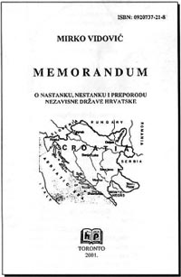 Posljednjih sam mjeseci imao malo nezahvalnijih zadaća od prikaza knjižice Mirka Vidovića Memorandum o nastanku, nestanku i preporodu Nezavisne Države Hrvatske (III + 37 str.) što ju je u nakladi od 1000 primjeraka 2001. u Torontu, “uz potporu Hrvata iz južnog Ontarija” tiskao Hrvatski put, s predgovorom Rudija Tomića.